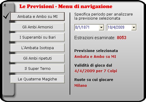 Il pulsante Spoglio serve per effettuare l'analisi statistica delle previsione in oggetto. Per fare questo, bisogna prima impostare i parametri di ricerca nella finestra Menu di Navigazione del pannello principale, specificando la ruota da esaminare e l'intervallo delle estrazioni.